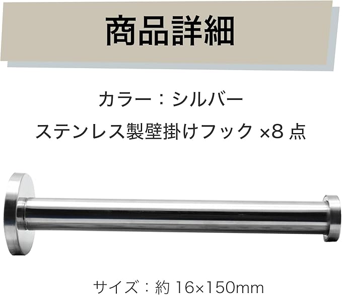 セット内容:ステンレス製壁掛けフック 8点 サイズ:約16 150mm カラー:シルバー ※モニターの環境等により、色の見え方に若干差が生じる場合がございます。
