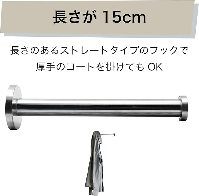 ステンレス製のスタイリッシュな壁掛けフック:ステンレス製の円筒形フックです。シンプルでスタイリッシュなデザインですので、お部屋に生活感を出したくない方におすすめ。ストレートタイプのフックですが、長さが15cmほどあり、先端には留めもありますので、厚手のコートを掛けてもOKです。