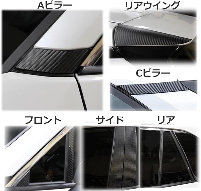 【汚れ防止/傷防止】 サイドピラーに取り付けることによって傷の防止になり何よりカーボンステッカーなので 見栄えも抜群によくなります。さりげないドレスアップは好感度もUP!に! 【取付方法】 サイドピラーの汚れを落とし借り合わせ。フィッティングを確認をお願いいたします。 シール式なのでゆっくり空気が入らないように張り付けましょう!