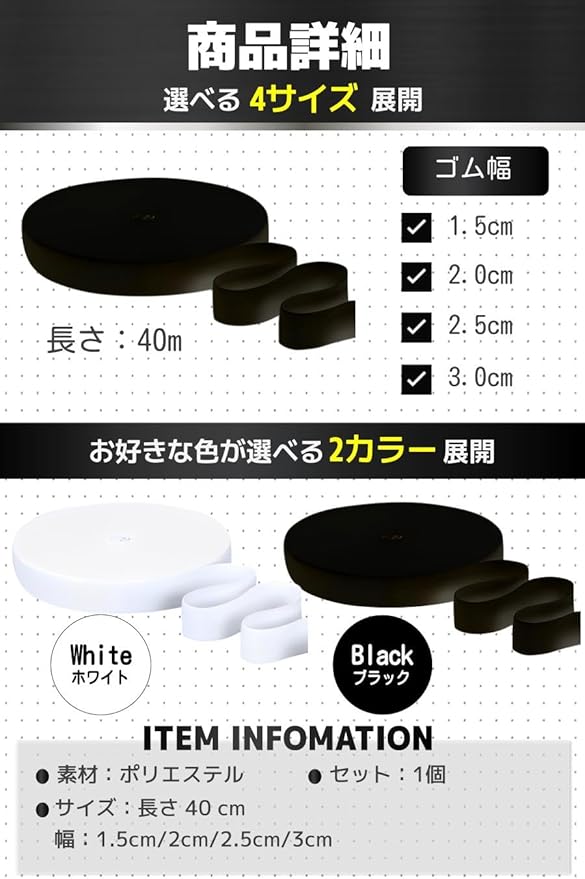 【商品特徴】①厚みのある素材 :丈夫な作りで摩擦や乾燥に強い /②繊細な編み目 :細かい編み目で肌触りも滑らか /③幅広い使用範囲 :衣類やバック、帽子など幅広く使える /④4つのサイズ展開 :目的や用途に応じてゴム幅が選べる【商品詳細】セット:1個素材:ポリエステル/サイズ:長さ 40m/幅1.5cm/2cm/2.5cm/3cm/