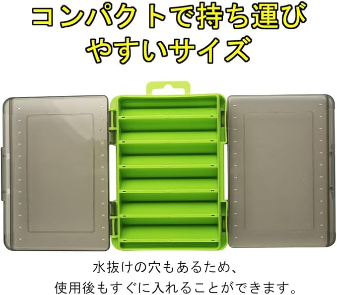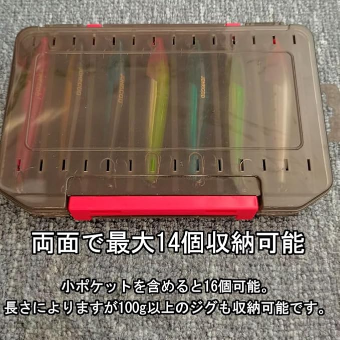 ABS樹脂(プラスチック)素材で作られているので軽量で頑丈で壊れにくく、100g以上の重いジグも収納できるのでショアジギング、ソルトライトジギングなど川や湖での釣りはもちろん、海釣りで青物など大物を釣るためのタックル収納ボックスとしても優秀です。