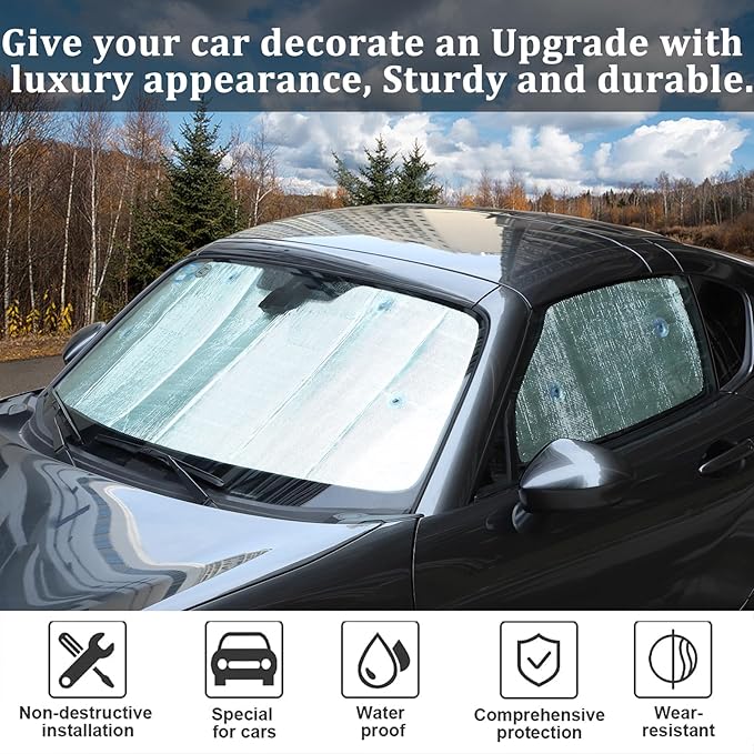 高品質の素材: 車用日焼け止めは、反射アルミホイルと二層バブル素材で作られており、有害な紫外線をブロックし、車を涼しく保ち、シート温度を下げ、車両のダッシュボード、ラジオ、LCDスクリーン、GPSデバイス、その他の電子機器の寿命を延ばします。