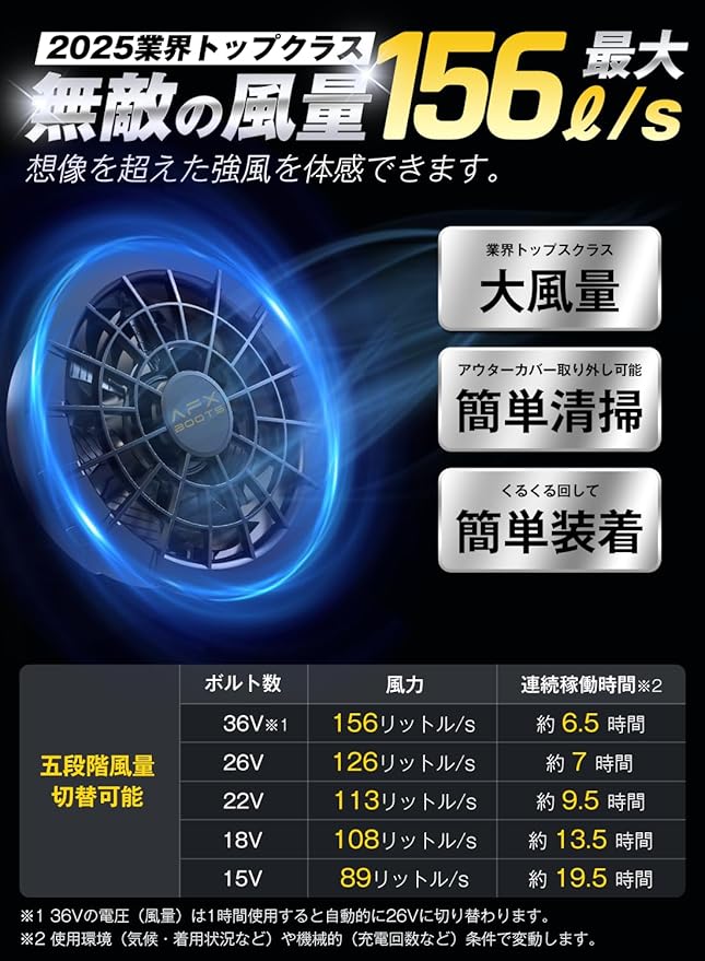 【36V超高出力・156ℓ/s特大風量】.出力は最大36Vの大幅なパワーアップ!新型暴風ファンと組み合わせて瞬間冷却可能な156リットル/秒の特大風量を実現しました!