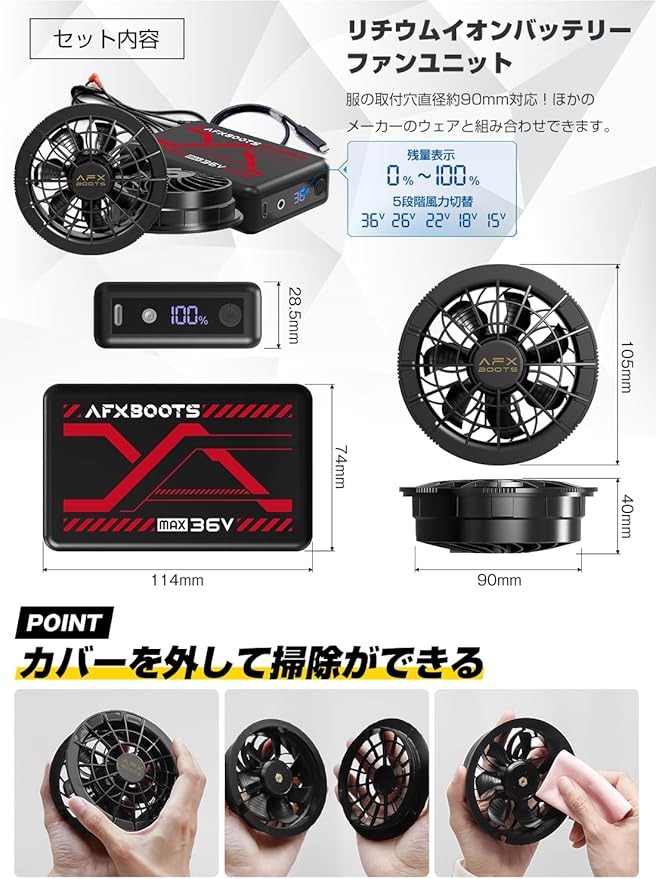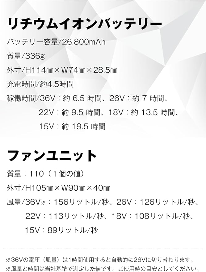 【セット内容・スペック】. 1、ファン 2、ファンケーブル 1、.書/取扱説明書 1。90mmファン穴対応の高い互換性を持っており、市販のファン付きウェア、パンツ、バックなどで使用することが可能です。稼働時間:15V(約19.5時間)、18V(約13.5時間)、22V(約9.5時間)、26V(約7時間)、36V(約6.5時間)