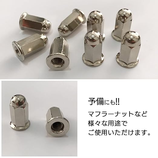 簡単に取り付けられるため、DIYでの車やバイクのメンテナンスにも最適です。外装パーツのアクセントとしても活用でき、機能性とデザイン性を兼ね備えたナットとなっています。手軽にストックできるため、予備として持っておくのも便利です。