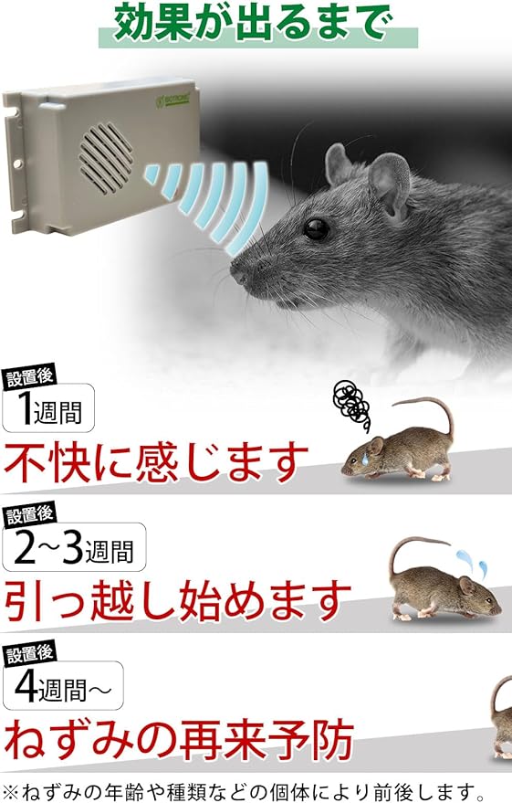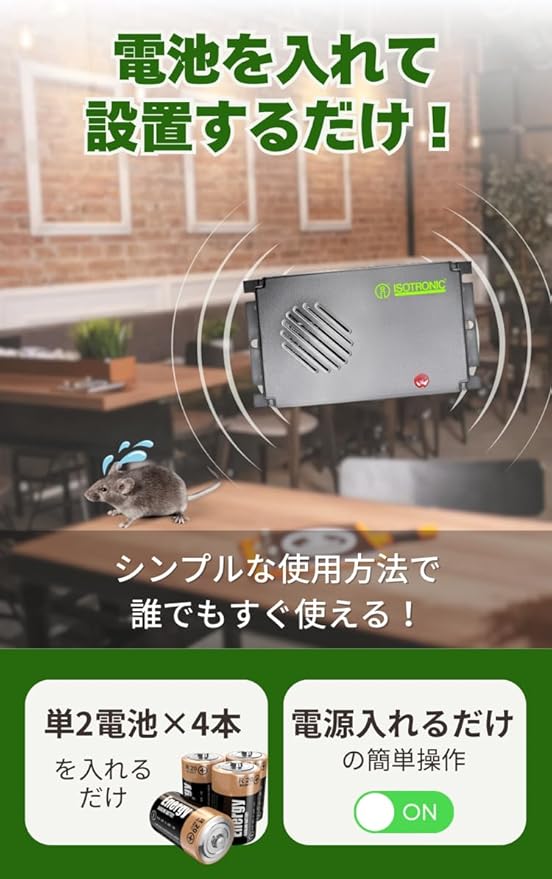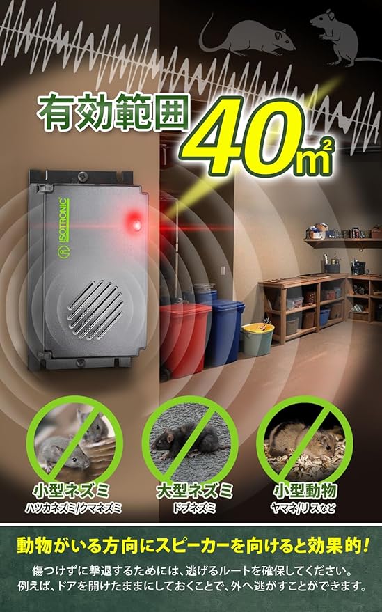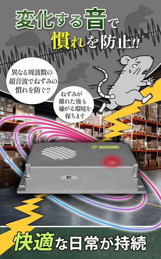 ねずみの好まない周波数の超音波でねずみ駆除。ねずみが習慣的に来るような場所においておくことで、ねずみが住みづらいと感じ、住処を変えるようになります。