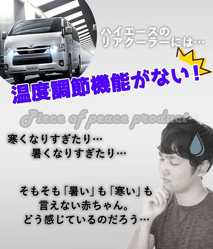 ■ 後部座席のお客さん。「暑い」と思うも、運転者を気遣い言い出せず。我慢。■ そもそも 「暑い」も「寒い」も言えない赤ちゃん。どう感じているのか心配。「そろそろこんな苦労から解放されたい!」という方も多いことでしょう。そこで今回お勧めするのが、そんな気苦労からあなたを開放し、ハイエースを快適空間に変えてくれる超優れもののアイテム。