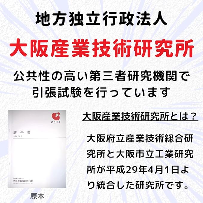 <<<地方独立行政法人大阪産業技術研究所 依頼試験報告書(令和3年11月4日 阪技術研顧客サ第1-03024)長軸:2,590 kgf(25.4 kN)>>>本報告書に記載の試験結果は、試験機関に提供した1つの試料に対する結果であり、商品全体の性能を代表するものではありません。