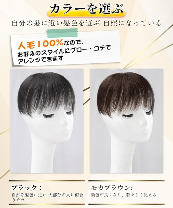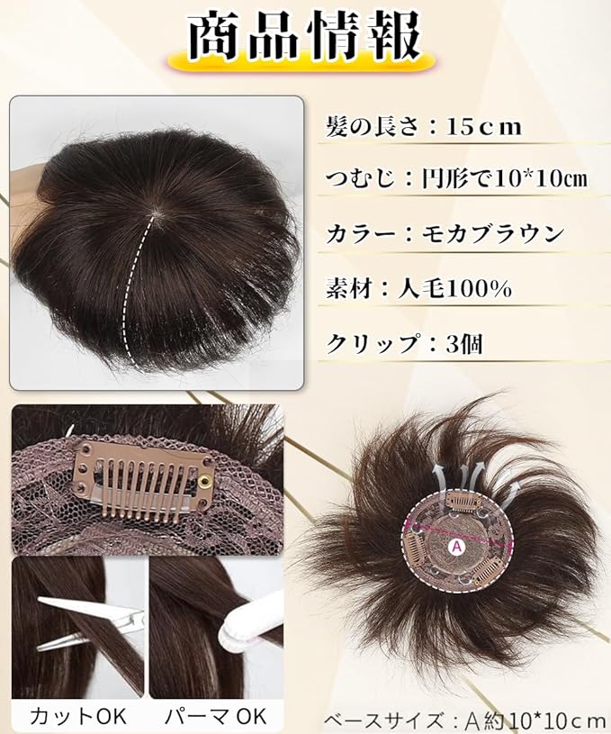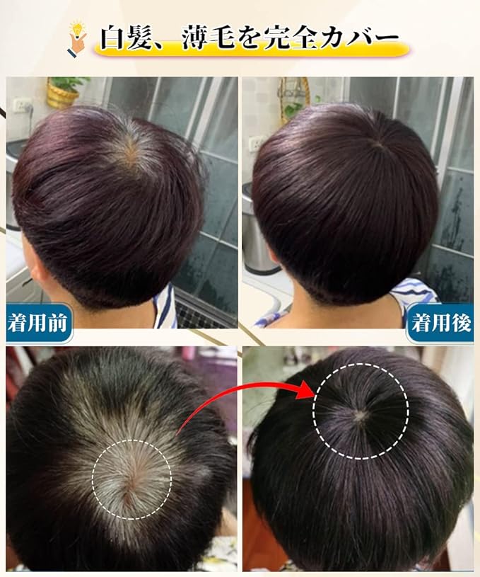 ご注意:このヘアピースはで、手作りのため、他のカラーの糸と白髪が混ざっている場合がございます。 検品時にできる限り取り除いておりますが、完全に取り除くことは難しいため、気になられる場合はご着用前にご確認頂き、 必要があれば根元から抜いて下さい。同様に、ウィッグ特有の匂いが気になる場合は風通しの良い日陰で数日干してからご使用下さい。