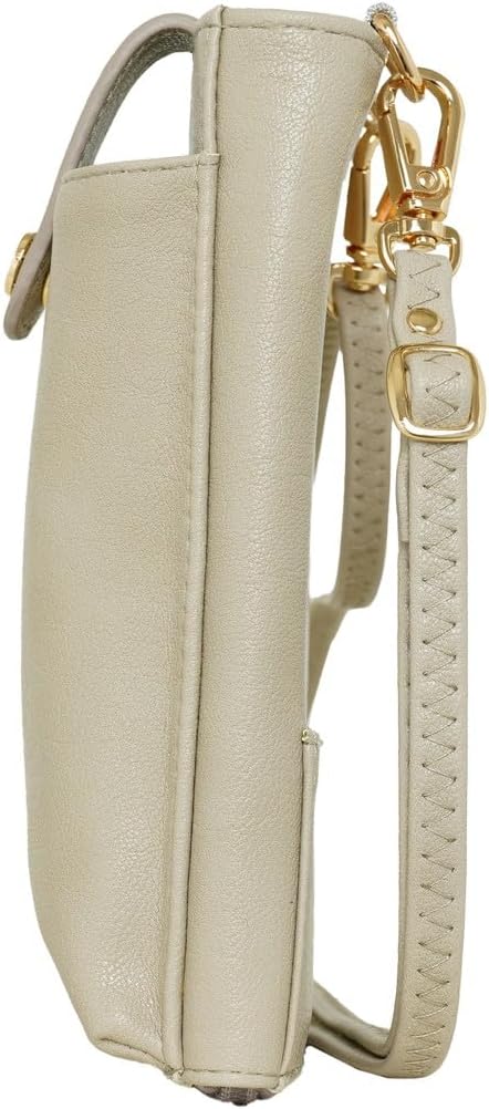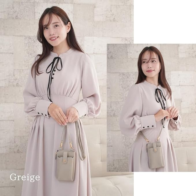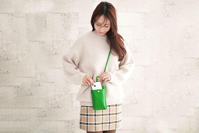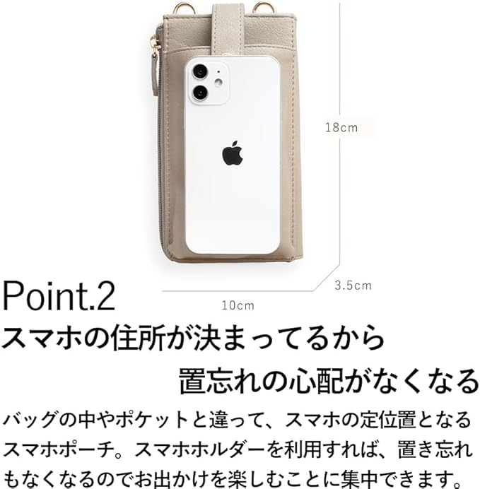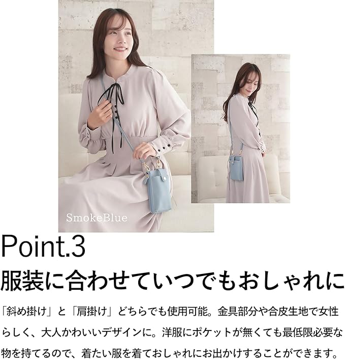 【服装に合わせていつでもおしゃれに】2way(斜め掛けと肩掛け)で使い分けできるスマホポーチ。ネックストラップは長過ぎず短過ぎず、程よい長さなので「斜め掛け」だけでなく、シーンに合わせて「肩掛け」でも使用することが可能です。カジュアルなファッションの時は斜めがけ、フォーマルなファッションの時は肩掛けと、どんな服装にも合わせられます。また、金具部分はシャンパンゴールド、生地は合皮でしっとりとした質感なので女性らしく、大人かわいいデザインに仕上げています。女性の服はポケットが無いか、あっても小さいことが多いですが、スマホポーチは身軽でありながら最低限必要な物をすべて持ち運びできるので、着たい服を着ておしゃれにお出かけすることができます。