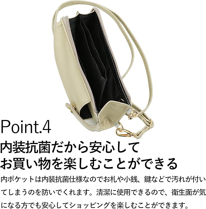 【内装抗菌だから安心してお買い物を楽しむことができる】中身の物に手で触れる機会の多い内装に、抗菌加工を施したスマホポーチ。内ポケットは内装抗菌仕様なのでお札や小銭、鍵などで汚れが付いてしまうのを防いでくれます。財布の中身を清潔に使用することができるので、衛生面が気になる方でも安心してショッピングを楽しむことができます。