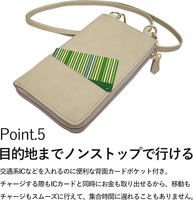 【これ一つで身軽にお出かけできて気持ちも軽やか】お財布機能付き貴重品もしっかり入る5つのポケット。ポーチの中はお札や小物等が入るフリースペース 2と、小銭ポケットが付いています。外側にはスマートフォンポケットと交通系ICカードポケットが付属していて、様々なニーズに合わせた使い方が可能です。また、取外し可能なキーリングが付属しているので鍵を付けておけば、急いで家を出たいときに限って鍵が見つからない、カバンの中で鍵が迷子になってしまった、そんなときに役立ちます。出かけるときはスマホショルダーさえ持てば「スマホ・財布・鍵」の外出するときに最低限必要なものすべてを忘れずに持つことができます。必要なものがこれ一つに収まるから、ちょっとしたお出かけなら身軽に動けて気持ちも足取りも軽やかになります。