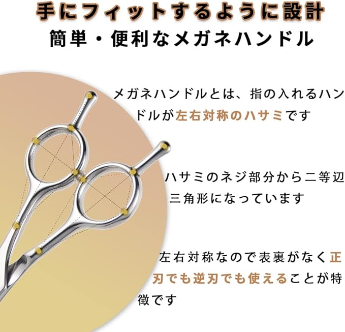 【正刃・逆刃両用カーブシザー】ハサミのハンドルは正刃・逆刃両用リバーシブルメガネ。顔周リ/足回リ/ボデイラインなど 部位によって向きを変えられます。