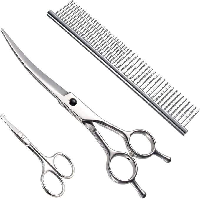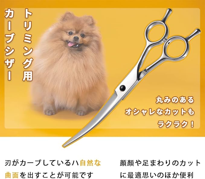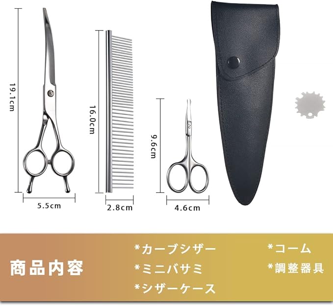 【ハサミケース付き】シンプルなPU革収納ケースにちゃんと収めてくれて保管や持ち運びにも便利な犬トリミングハサミ。商品内容:カーブシザー、ミニカットシザー、シザーケース、コーム、ネジ調整器具