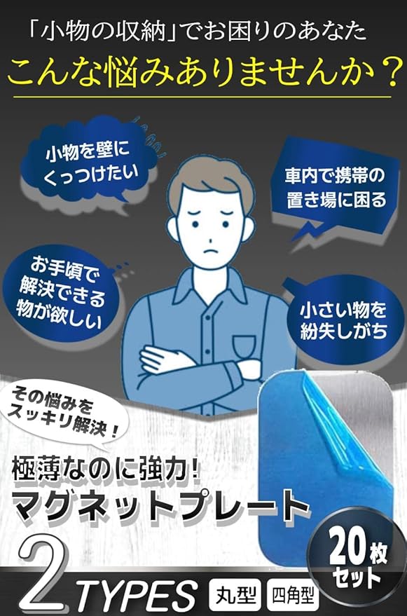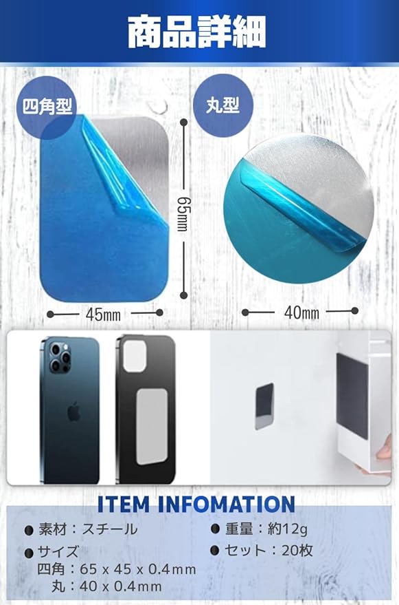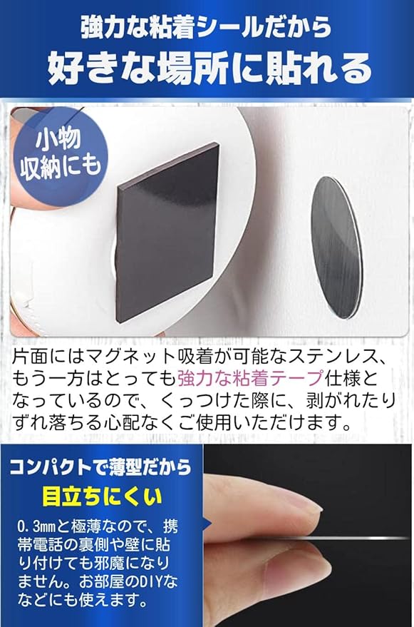 【商品特徴】 強力な粘着シール:高い粘着力だから剥がれずらい 角が丸くて安全:角が鋭くないので手指を傷つけない 極薄で邪魔にならない:0.3mmの薄型だから、目立ちにくい 色んな場所で使える:平らな場所につくから車でも使える【商品詳細】 重量:約12g 素材:スチール セット:20枚 サイズ 四角:65 x 45 x 0.4mm 丸:40 x 0.4mm