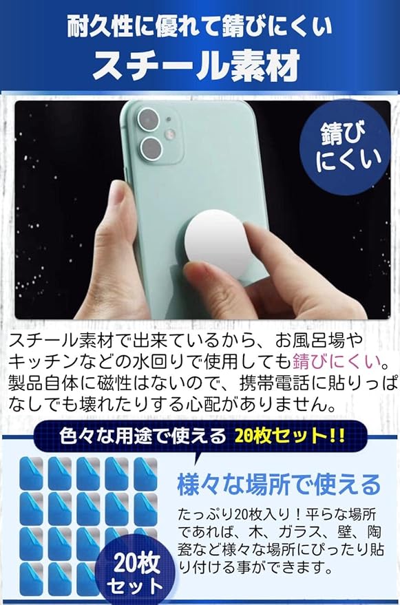 【スチール素材】 スチール素材で出来ているから、お風呂場や キッチンなどの水回りで使用しても錆びにくい。製品自体に磁性はないので、携帯電話に貼りっぱなしでも壊れたりする心配がありません。