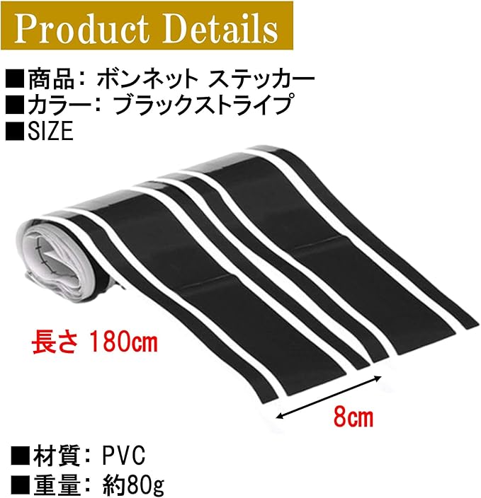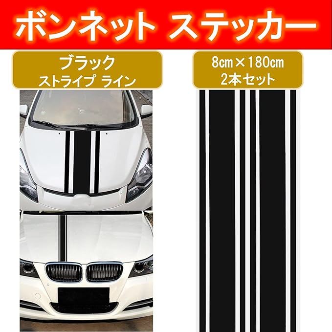 商品詳細: ボンネット ステッカー 【カラー】 ブラックストライプ 【サイズ】 長さ180㎝ 横幅8㎝ 2本セット(1枚の台紙に2本貼ってあります) 【材質】 PVC 【重量】 約80g