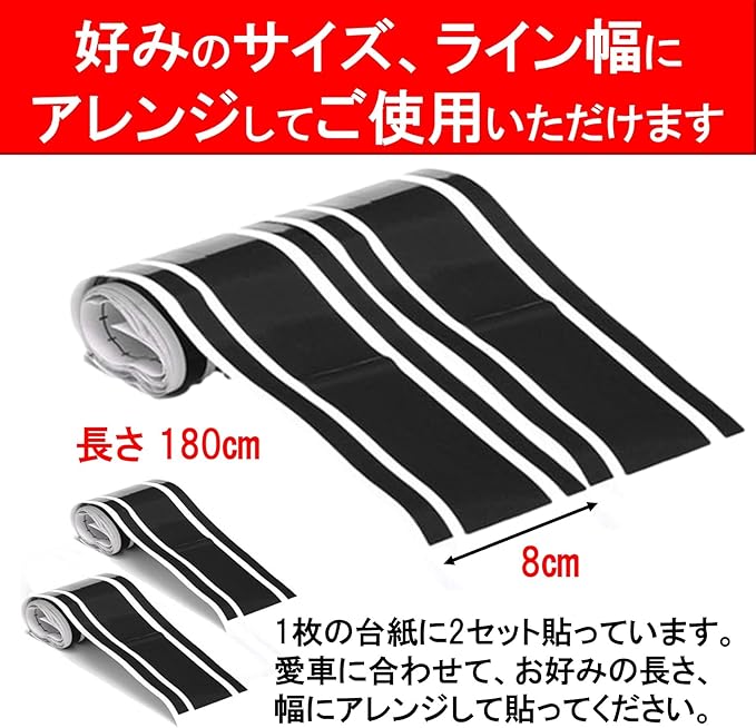 横幅8㎝ 長さ180㎝のステッカーが2本セットとなります。1枚の台紙に2セットを貼っていますので、愛車に合わせてお好みのサイズにアレンジしてご活用ください。