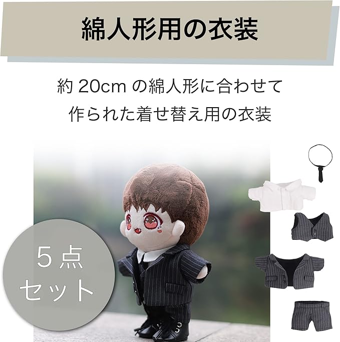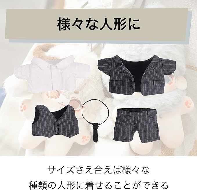 フォーマルな衣装:ワイシャツ、ベスト、ネクタイ、ズボン、上着が揃ったフォーマルな衣装となっています。ストライプのスーツが人形をクールにカッコよくイメージチェンジさせてくれます。