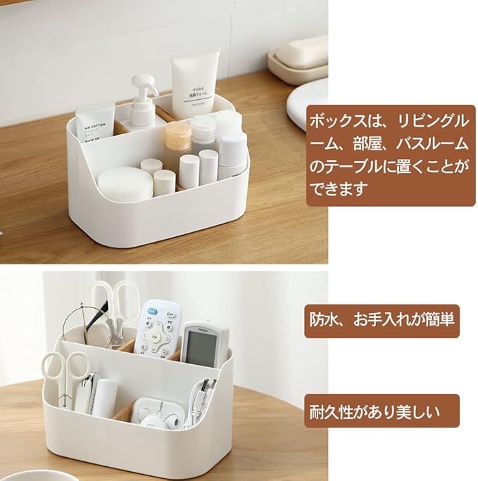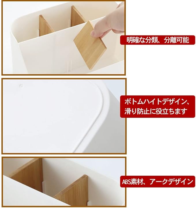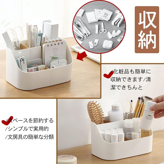 収納ボックスはいろいろなものを分類して整理することができます: ペン、定規、消しゴム、はさみ、メモ、手帳などの文房具用品、化粧ブラシ、アイシャドウ、化粧水、口紅、リップクリーム、クリーム、アイクリーム、保湿クリームなどの化粧品、リモコン、綿棒、歯の線、絆創膏、鍵、印鑑などの日常用品。