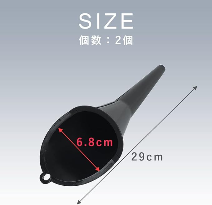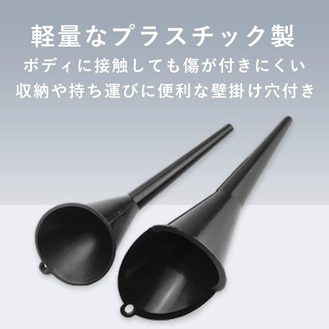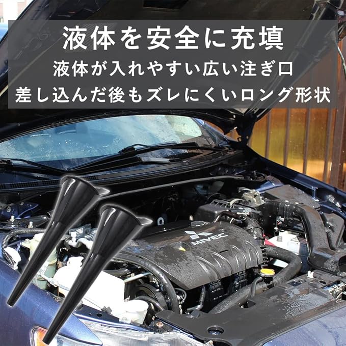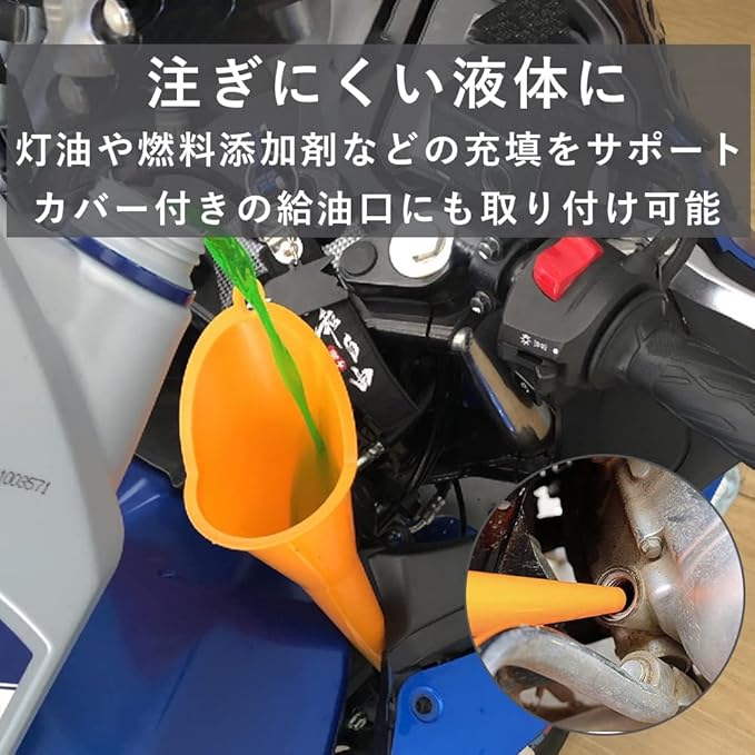 【注ぎにくい液体に】やガゾリンなどの燃料、車用の燃料添加剤、ウォッシャー液など素手での作業が難しい液体の充填をサポートします。長さがあるため給油口にカバーがついてる車にも対応します。