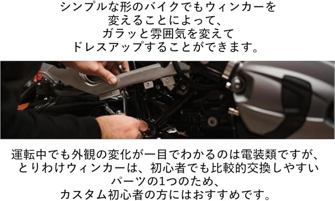 運転中でも、外観の変化が一目でわかるのは電装類ですが、とりわけウィンカーは、初心者でも比較的交換しやすいパーツの1つのため、カスタム初心者の方にはおすすめです。