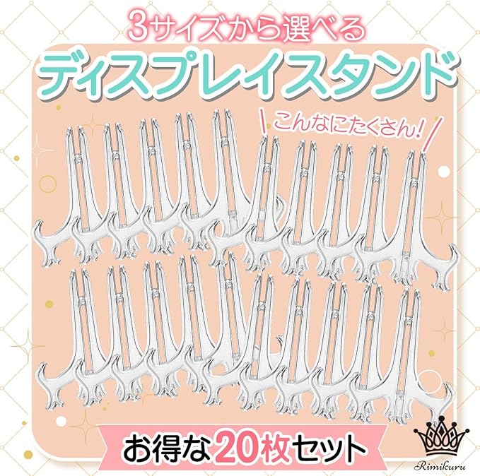 【商品仕様】セット内容:アクリル ディスプレイスタンド 20個セット サイズ:Mサイズ (高さ)約7.5cm , (スタンドの開き幅)約6.0cm , (適用直径)約7.0~10.0cm カラー:透明 材質:プラスチック ※モニターの環境等により、色の見え方に若干差が生じる場合がございます。