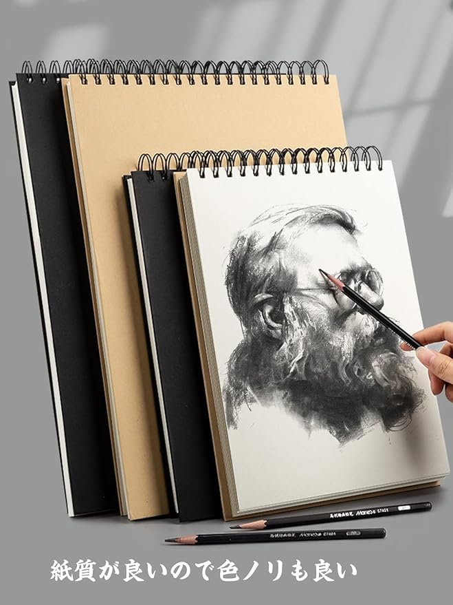 【厚口て丈夫な画用紙お絵かき帳】スケッチ紙厚み:160gsm 消しゴムで何回消しても毛羽立ちにくく、複数の図面に耐えることができます。このスパイラルスケッチブックは、スケッチ、ペイント、ライティングに使用できます。色鉛筆、マーカーペン、クレヨン、パステル、ボールーペンなどの様々な画材との相性は抜群で書き心地が良いです。