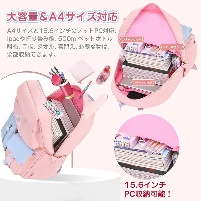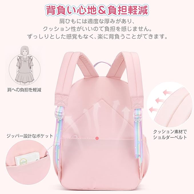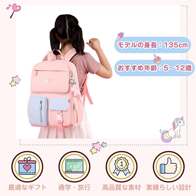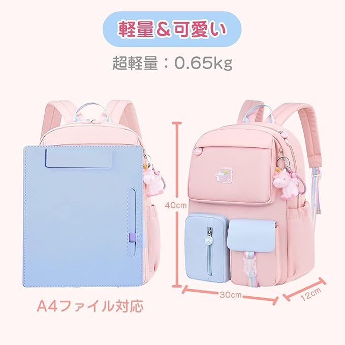 BOOLIJ リュック キッズ 子供 リュックサック ユニコーンチャーム付き 通園 通学 かわいい 女の子 小学生 大容量 A4対応 防水 アウトドア 旅行 遠足 プレゼント ピンク&ブルー LL | oioioichan