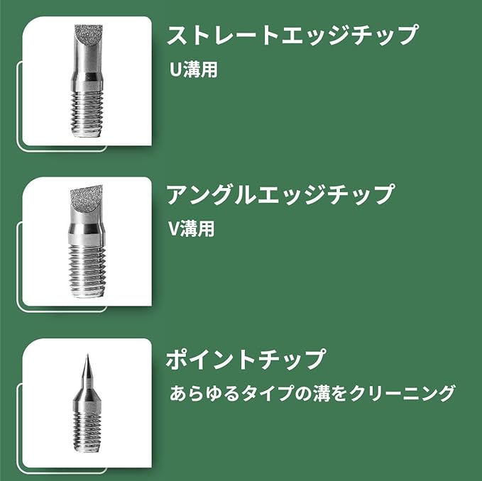 【3つのツールが1つに】 - グルーブシャープナーにはU溝用のストレートエッジチップ、V溝用の先端が傾斜したアングルエッジチップ、溝をクリーニングするための先端が尖ったポイントチップが付属しています。