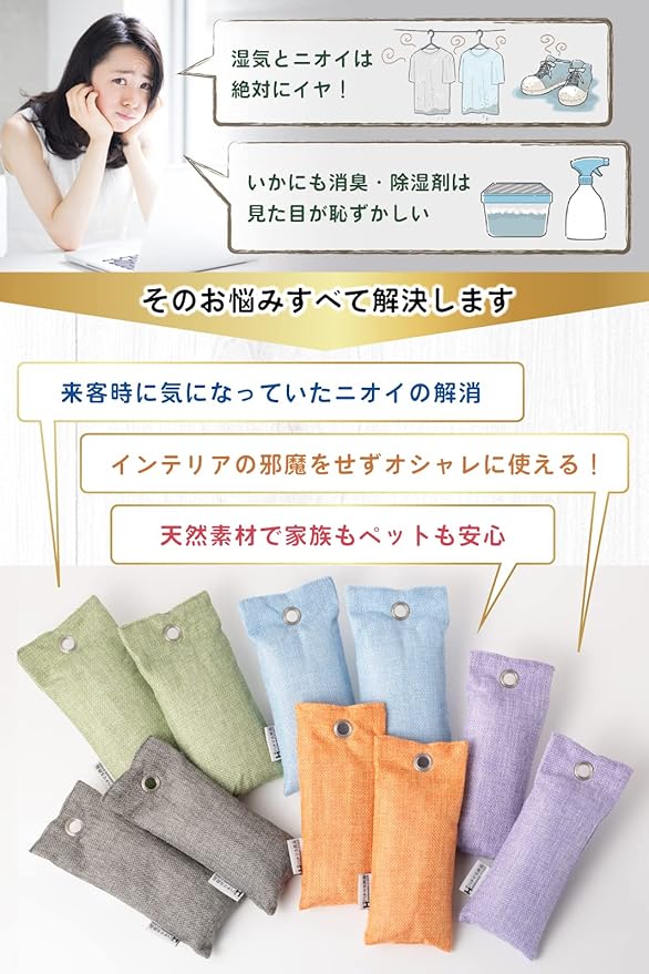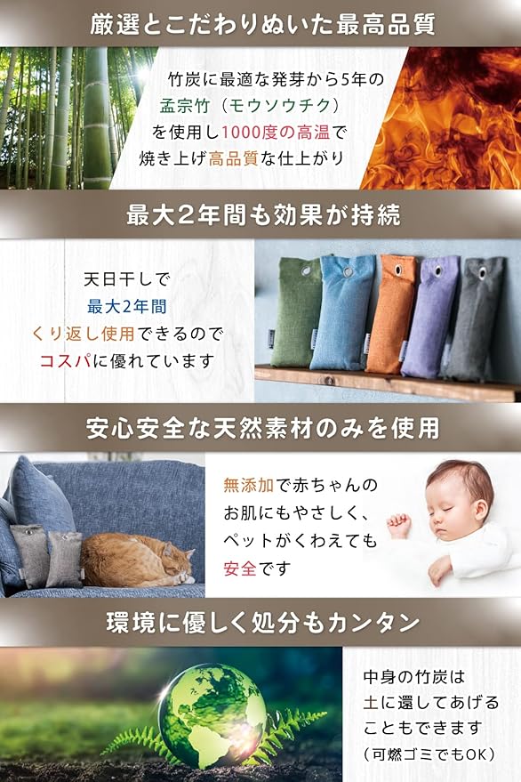 【コスパに優れた高品質と安心・安全素材】天日干しで最大2年間くり返し使用できるのでコスパに優れて経済的。竹炭の粉が漏れ出る心配がない、耐久性に優れた二重構造。無添加 で 天然素材 のみを使用していますので 赤ちゃん や ペット がいるご家庭でも安心してお使いいただけます。もちろん、環境に優しく処分もカンタン。使い終わった後は可燃ゴミとして捨てるのが一般的ですが、中身の 竹炭 は土に還したり、として使用していただくこともできます。