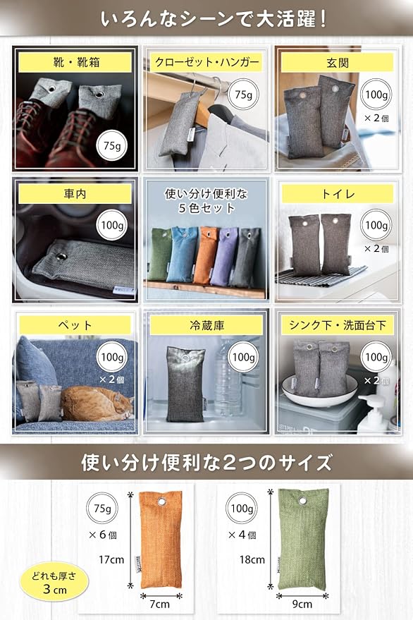 【いろんなシーンで大活躍】通常の置き型やスプレー式の 消臭剤 除湿剤 乾燥剤 のように外観で目立つことなく、インテリアに溶け込んで オシャレ にご使用いただけます。小さいサイズは 靴 消臭 、大きいサイズは 下駄箱 消臭 などに使い分けが便利で、ハトメ加工により ハンガー に吊るすこともできるので、 クローゼット 消臭 や クローゼット 除湿 にも効果を発揮します。その他、 シューズボックス( 靴箱 ) 玄関 部屋 タンス 衣装ケース お弁当などを入れたバッグ スーツケース 車内 ペット トイレ 洗面台下 シンク下 冷蔵庫 ロッカー などにポンと置くだけで使い方も超カンタン。