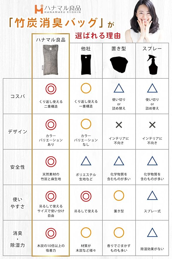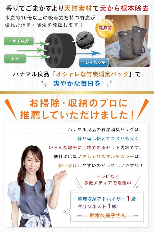 【消臭・除湿・抗菌 ニオイのモトから根本除去】 ハナマル良品の竹炭バッグは、 消臭 脱臭 除湿 効果を最大限に発揮するため、厳選された高品質の優れた竹炭のみを使用!木炭や備長炭の10倍の吸着力でニオイのモトから根本除去!天然の竹炭ですので、香でごまかす 消臭剤 とは違い、 無臭 でイヤなニオイと混ざることなく自然で爽やかな環境でご使用いただけます。また、 調湿 効果にも優れており 除湿剤 として 湿気取り にも最適です!空気中のニオイ物質や水分を吸着し、空気の清浄と雑菌の繁殖を防ぐ 抗菌 作用!