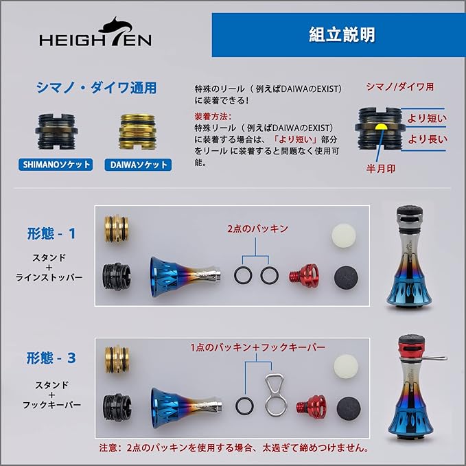【付属品】1個のシマノソケット、1個のダイワソケット、1個の夜光キャップ、3個の予備用ゴム製パッキン、1個のフックキーパー。