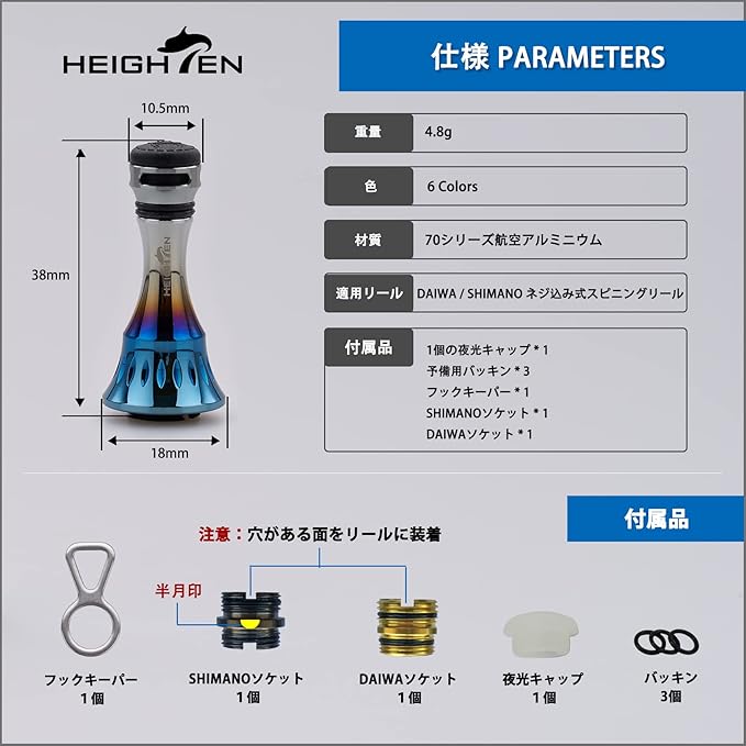 【製品仕様】本体長さ: 38mm、自重: 4.8g、材質:70航空アルミ【対応機種】シマノ/ダイワ通用(2種類のソケット付属)