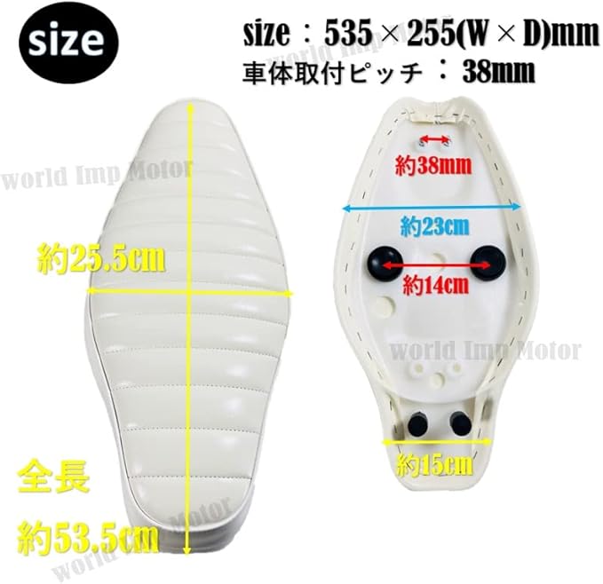 【商品仕様】 ・座席サイズ:約53.5cm ・横幅:約cm〜25.5cm ・取り付けピッチ:約38mm ・重量:約1.1kg ・カラー:ブラック・ブラック02(ライン色ホワイト)・ホワイト・ブラウンの4色