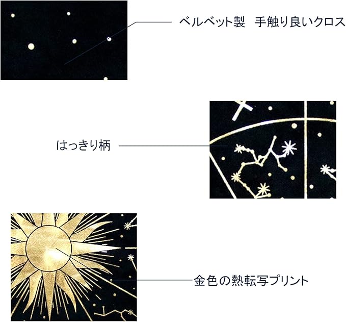 【デザイン】星座、月相、太陽を組み合わせたクラシックなタロットカードデザイン! 絶妙なプリントでデザインされた、パターンはとても美しいです。 金色の熱転写プリント 加工生地 、 占いの神秘的な雰囲気を作り、没入型の体験をもたらします。