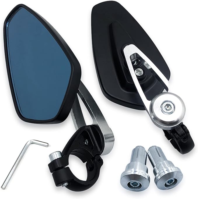 六角レンチが付属しているので到着したら他に工具が無くてもバーエンドに簡単に取り付けが可能で、360度自由に角度調整もできます。 また、ブルー鏡(レンズ)なので走行中の眩しさを軽減するのも嬉しいポイントかと思います! ※対応ハンドル外径は約22mm(7/8 標準)です。
