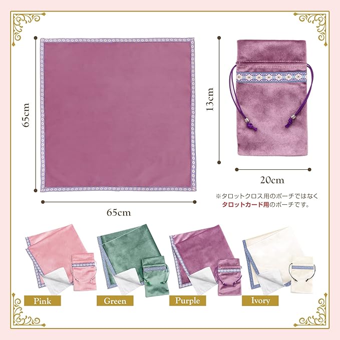 ✅【セット詳細】■セット内容:タロットカードクロス 1枚、タロットカード用ポーチ 1枚 ■サイズ:タロットクロス 約65cm 約65cm タロットカード用ポーチ 約20cm 約13cm ■素材:ベルベット(ポリエステル100%)粗悪な偽物やコピー商品が出回っておりますのでご注意下さい。商標登録6615800