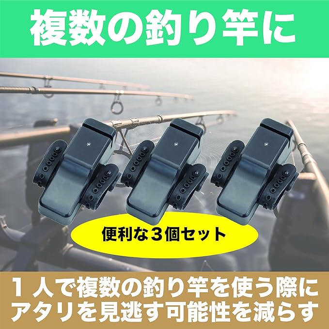 複数の釣り竿に取り付け可能:こちらの商品には、同じヒットセンサーが3個含まれているので、複数の釣り竿に取り付けることが可能です。1人で複数の釣り竿を使う際に、うっかりアタリを見逃してしまう可能性を減らすことができます。