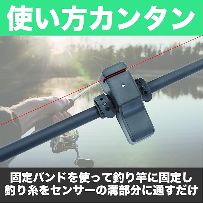 使い方も簡単:このヒットセンサーの使い方はとても簡単です。固定バンドを使って釣り竿に固定し、釣り糸をセンサーの溝部分に通すだけなので、手間がかかりにくいです。固定バンドは釣り竿の太さに合わせて調節することができます。