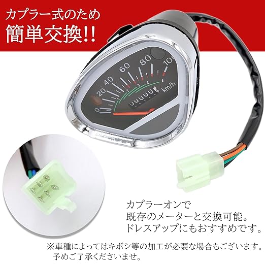 純正交換タイプで速度は100キロ(100km/h)まで対応しています。 カスタムやドレスアップだけでなく、メーターの経年劣化や、故障、破損時の交換部品、予備パーツとしてもオススメです。