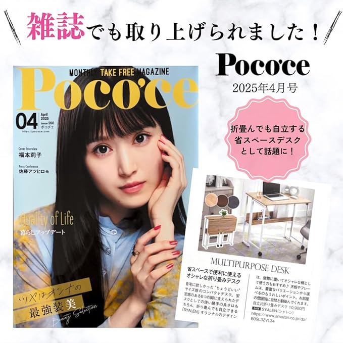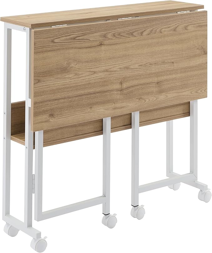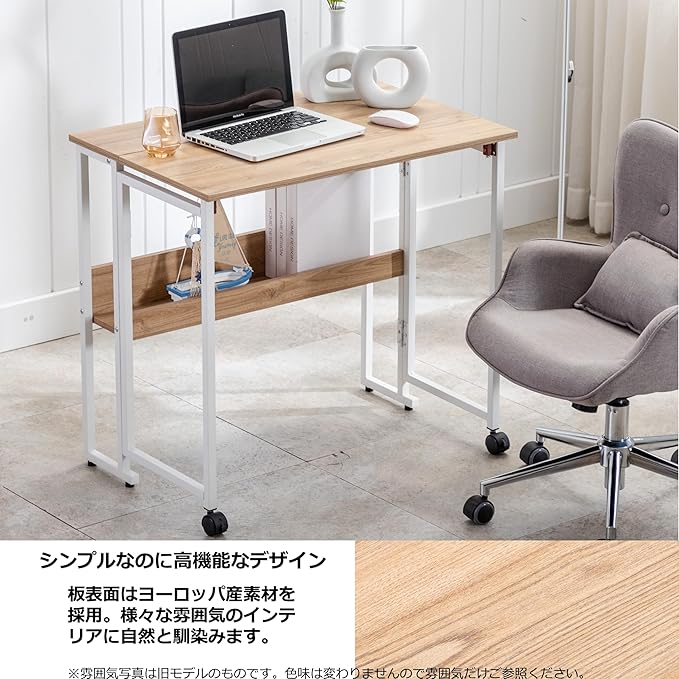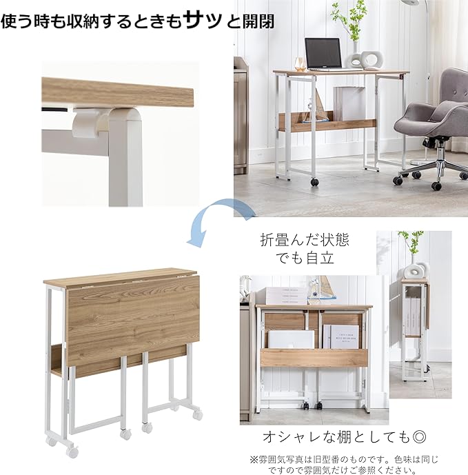 【高機能折り畳み式デスク】天板下のボタンを押すだけで、簡単に折り畳むことができます。インテリアを置く物置や、ドレッサー、キッチンでのサイドテーブルとしても活用可能 。オフィスや、作業台、子供用の勉強机、在宅ワークなど多目的用途で使用できます。