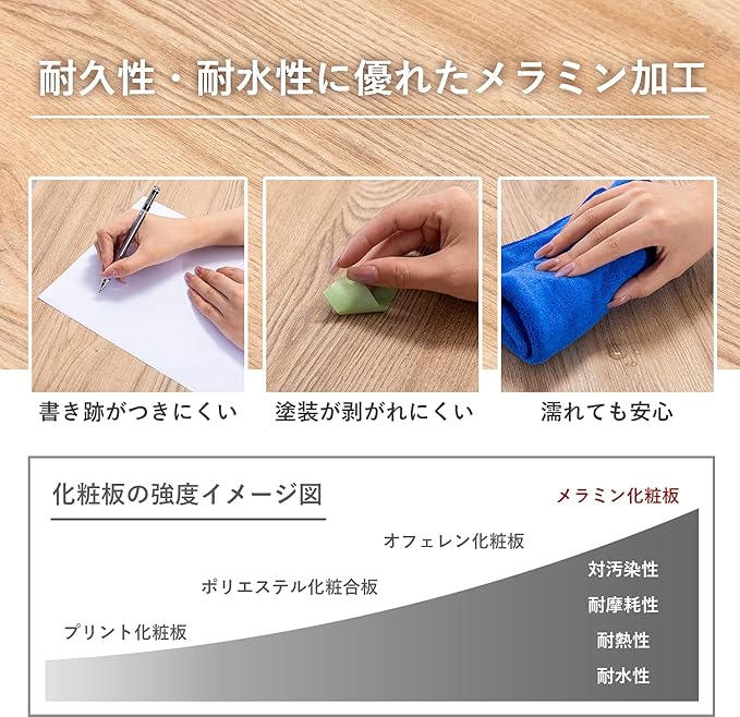 【高強度メラミン加工】メラミンで表面を加工し、水や汚れ、傷に強く、汚れた時もサッと簡単に拭くことができお手入れも簡単です。パーティクルボードを使用しているため、耐久性を保ちつつ軽量化を実現しました。