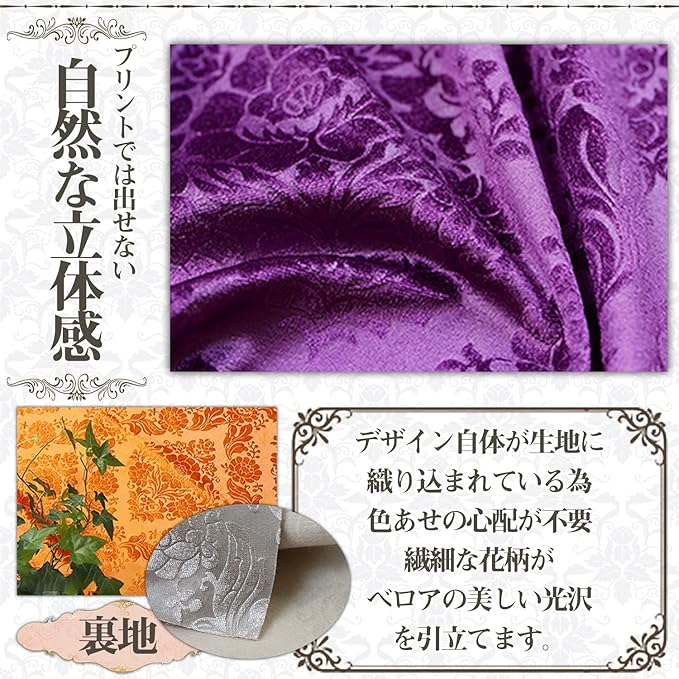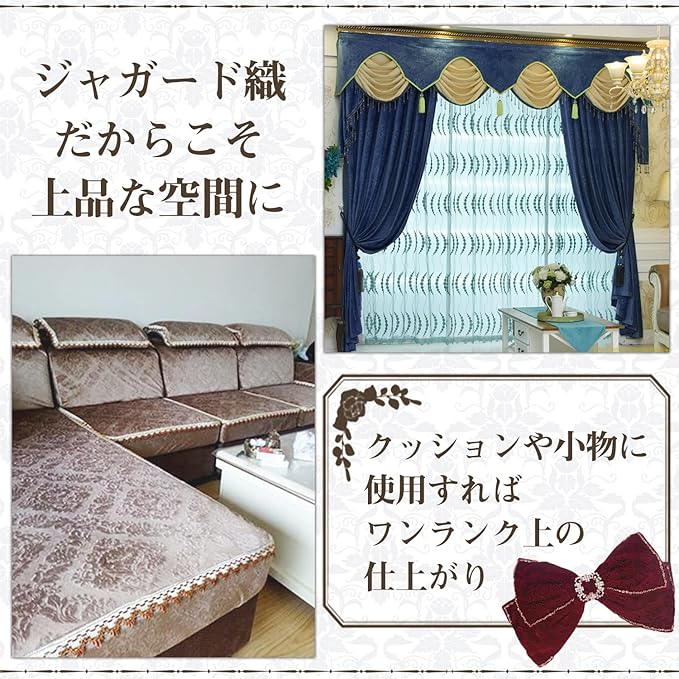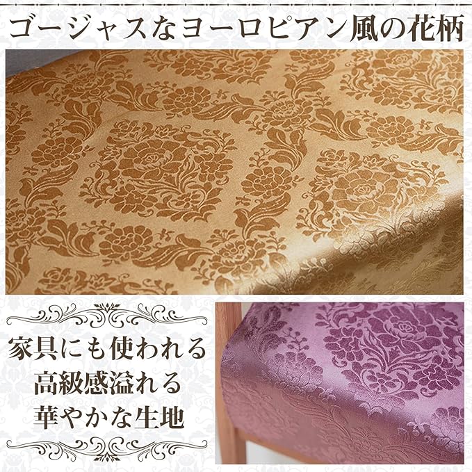 複雑な柄を再現すればするほど高級感が出るとともに、プリント生地のように色あせたり色落ちしたりという心配がないのも魅力で、厚みがある為耐久性にも優れています。今回はヨーロピアン風デザインをジャガード織でベロアに施すことにより、高級感をさらに底上げしベロア独特の上品な光沢に合った仕上がりになっています。