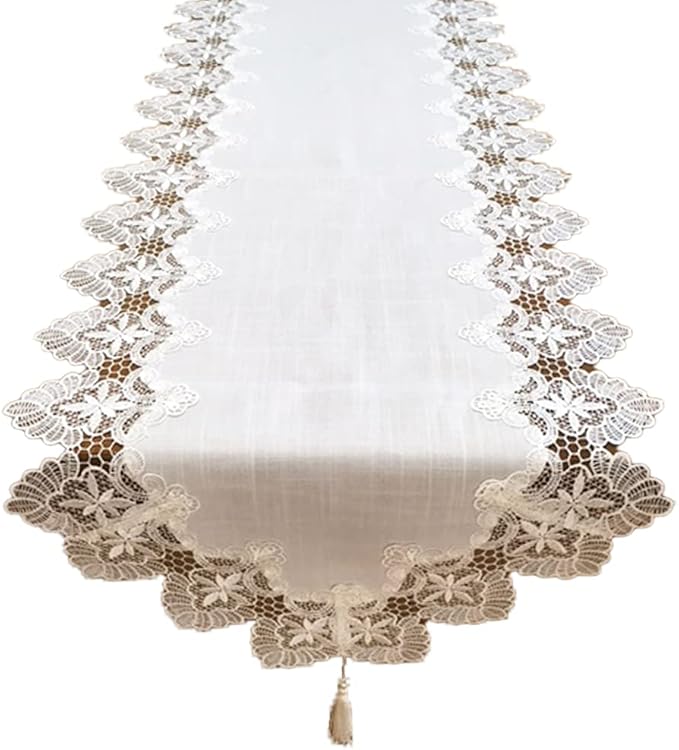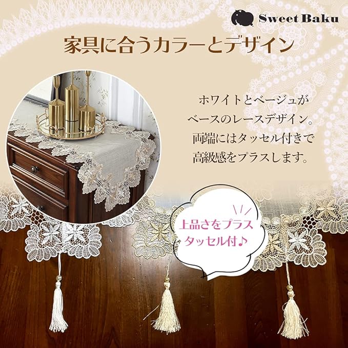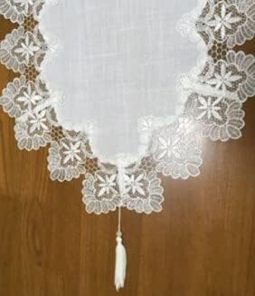 【特徴】美しいヨーロピアンレースの縁取りとタッセル付きのテーブルランナー