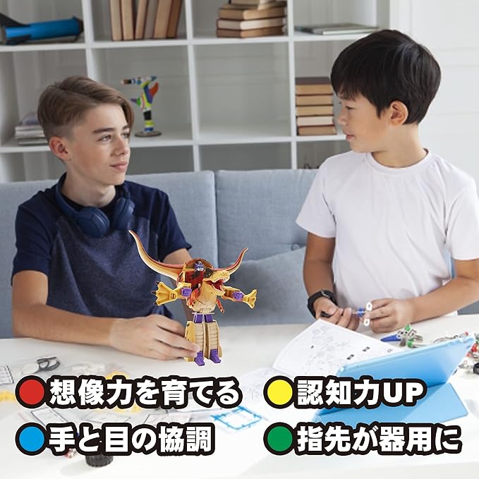【遊びながら学べる】ロボットを変形させる時は、自らストーリーを描きながら遊びます。自分で考え遊ぶ事で自立に必要な力を身に付けられます。また指先を使うので神経が刺激され脳の発達に良い影響を与えます。