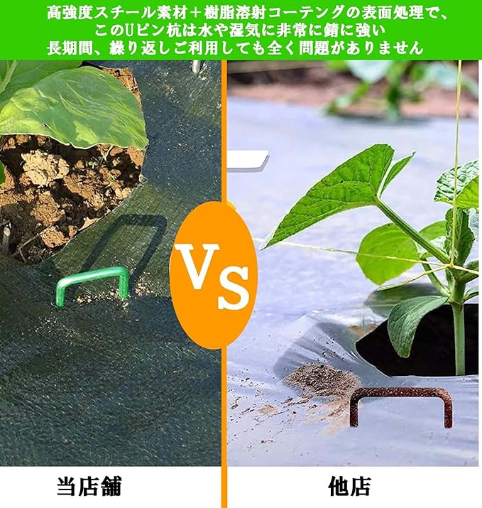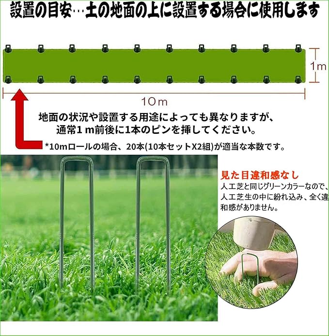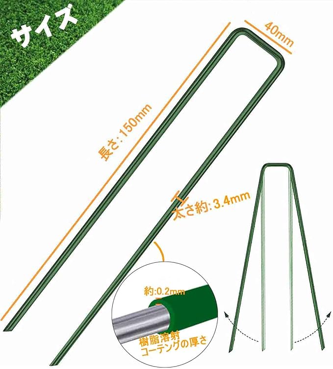 繰り返し使用:U字ピンは堅いステンレスで加工していて、表面は焼き付け塗装になります。グリーンカラーが剥がれにくく、錆もにくく丈夫で長持ち!路肩、畑、菜園、果樹園、花壇、空き地、建物まわり等色々なところのシードを固定できます。変形、老化と腐食を防止しているので、繰り返し使用できます。