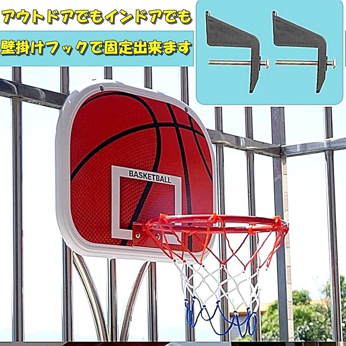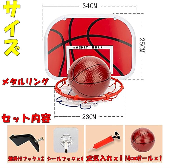 ✅【セット内容】バスケットゴール、ゴールネット、ボール、エアポンプ、壁掛けフックx2、シールタイプフック 4枚【サイズ】ゴール板:34 25cm ゴールリング:23cm ボール:14cm