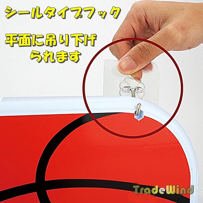 付属コンポーネント バスケットボード、ゴールネット、ボール、エアポンプ、壁掛けフック、シールタイプフック